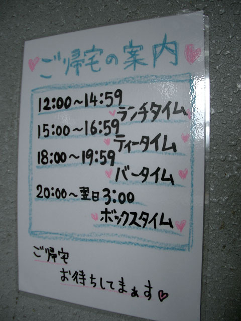 (新)12時〜17時画像にあるバータイム(18時〜19時59分)は詳細を確認できておりません.(うっかり聞きそびれました...迂闊orz.)一応,バータイムもお日様タイムに含まれるようなのですが・・・状況を調べてから改めて紹介するという形にします.ご了承ください.