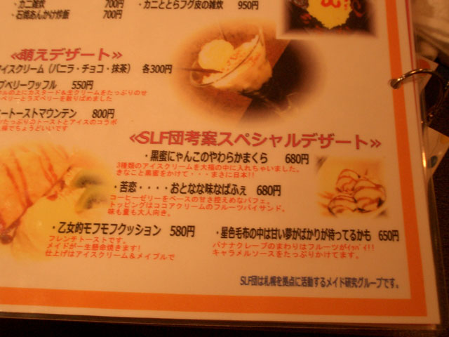 お店の中央付近の座席あるいは、小上がり(?)に座ると、客からもお店全体が見通せます。団体さんが入って騒がしくなると、お店が小さいだけにかなり響く。良く言えばワイワイ楽しげな雰囲気と言えるかな。静かにしんみり飲みたいタイプだと、同じメイド居酒屋ってことで言えば、先月閉店した桜っこよりも難しいかもしれない。