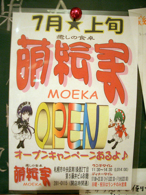 【札幌】新琴似に動きあり!?(http://newscrouton.blog.shinobi.jp/Entry/126/)なぜ,そんな麻生にメイドカフェを作ろうと思ったのか?北のメイド系をずっと追いかけてきた身としては,自然に湧いてきた疑問だったのでオーナー(マネージャー?)さんに聞いてみたのです.話を聞くところによれば,ひとつは「麻生地区では誰もまだやってない」ということ.もう一つは「麻生の飲み屋さんは中心部から外れてしまっているため,何か面白いことをやってみようと思った」とのこと.